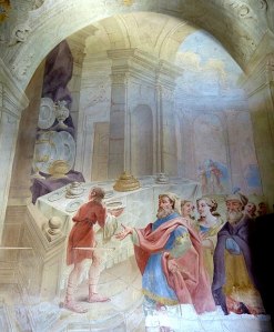 Aldersbach abbey ( Lower Bavaria ). Mary Assumption parish church: Narthex – Fresco (1760) illustrating the Gospel of Matthew 22, 7: “See, the meal is ready, come!”